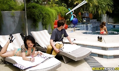 Two utter hotties are impressed with his pool and give up the pussy