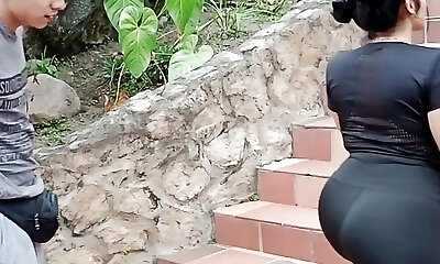 темноволосая брюнетка с большой задницей ласкает языком свои мокрые от пота половые губы и проникает в них во время пешего похода